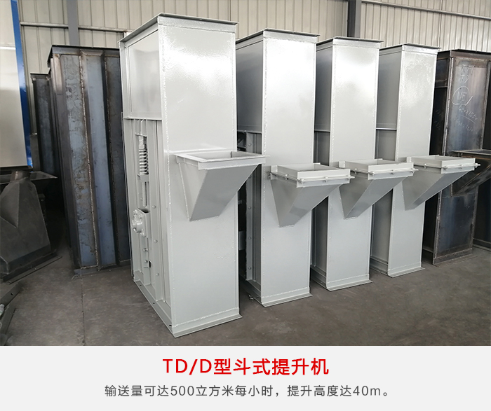 TD型斗式提升機(jī)由運(yùn)行部分料斗與牽引膠帶、帶有傳動(dòng)滾筒的 上部區(qū)段,帶有拉緊滾筒的下部區(qū)段,中間機(jī)殼,驅(qū)動(dòng)裝置,逆止制動(dòng)裝置等組成。無故障時(shí)間超過2萬小時(shí),輸送量可達(dá)500m³/h,提升高度達(dá)40m。
