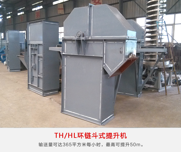 TH/HL環(huán)鏈斗式提升機(jī)牽引機(jī)構(gòu)是兩根環(huán)形鏈條,為混合或重力方式卸料,掏取式裝料,輸送量可達(dá)365m³/h,最高可提升50m。