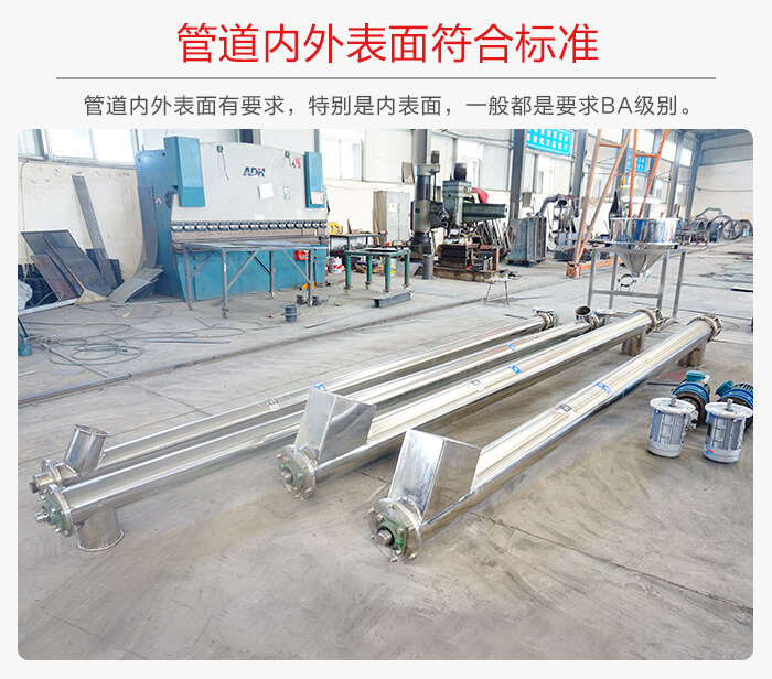 除了材質以外,還對管道內外表面有要求,特別是內表面,一般都是要求BA級別,管道表面的光潔標準主要有AP、BA、EP三種,EP是電化學級別比較貴!所以不銹鋼螺旋輸送機使用到食品行業是可以的。