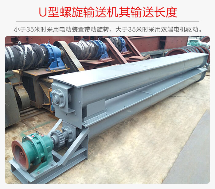 U型螺旋輸送機的輸送長的有兩種,其一:殼體長度小于35m的其螺旋軸是采用一端單電動裝置帶動主軸的旋轉(zhuǎn),而當(dāng)其長度大于35m時就可采用兩端雙電動裝置帶動主軸旋轉(zhuǎn)。