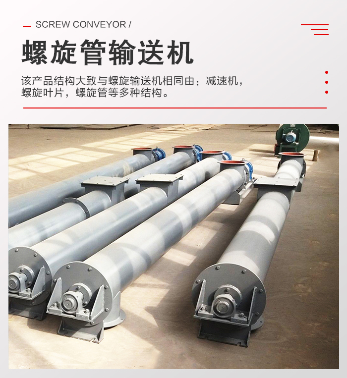 簡介:螺旋管輸送機該設(shè)備整體由圓管構(gòu)成,所以很多人稱之為螺旋管輸送機。