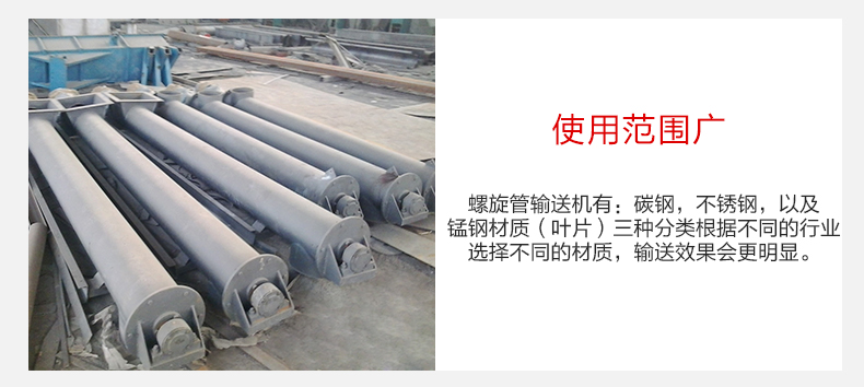 3,產(chǎn)品材質(zhì)可供多個行業(yè)進行選擇,螺旋管輸送機有:碳鋼,不銹鋼,以及錳鋼材質(zhì)(葉片)三種分類根據(jù)不同的行業(yè)選擇不同的材質(zhì),輸送效果會更明顯。