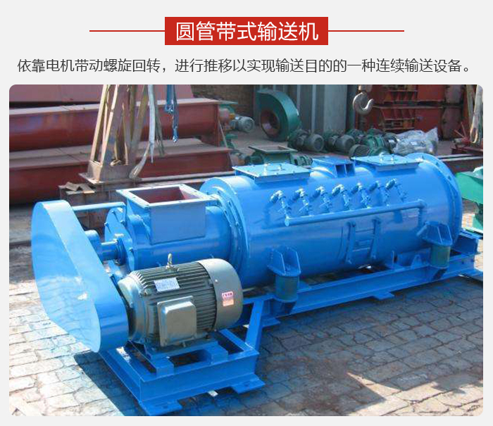 圓管帶式輸送機是依靠電機帶動螺旋回轉,對物料進行推移以實現輸送目的的一種連續輸送設備,可以水平、傾斜、垂直輸送粉末、顆粒及小塊狀物料。具有結構簡單、橫截面積小、密封性好、操作方便、維修容易、便于封閉運輸等優點。