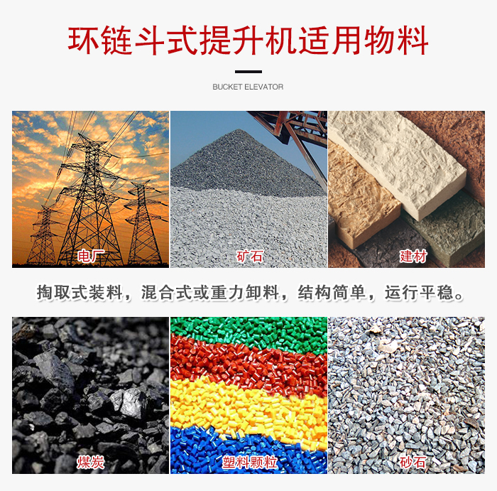 環(huán)鏈斗式提升機(jī)適用于垂直輸送磨琢性較大的粉狀、粒狀、及小塊狀物料,如糧食、煤、水泥、碎礦石等,輸送高度不超過(guò)40m,其特點(diǎn)為,結(jié)構(gòu)簡(jiǎn)單,運(yùn)行平穩(wěn),掏取式裝料,混合式或重力卸料,輪緣采用組合鏈輪,更換方便,鏈輪輪緣經(jīng)特殊處理壽命長(zhǎng),下部如采用重力自動(dòng)張緊裝置,能保持恒定的張力,避免打滑或脫鏈,同時(shí)在料斗遇阻時(shí),有一定的容讓性能夠有效地保護(hù)運(yùn)動(dòng)部件,物料溫度不超過(guò)250℃。